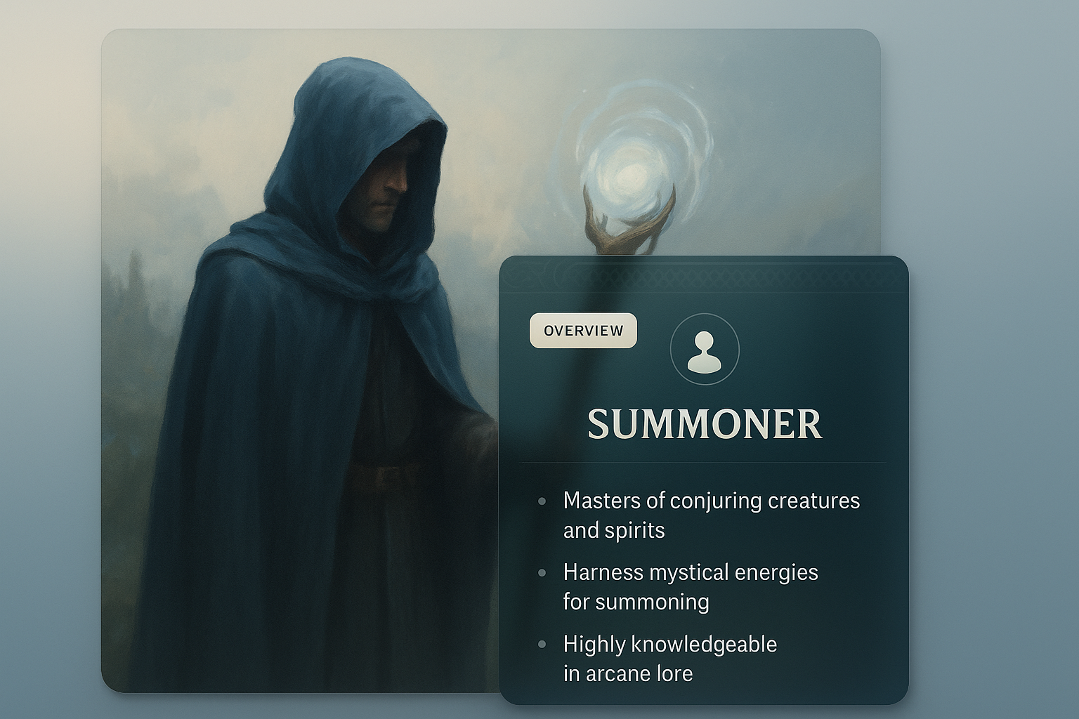 A light-themed web page featuring a summoner character with a mystical orb. The design includes integrated blocks with text, icons, and a cohesive layout for enhanced readability.