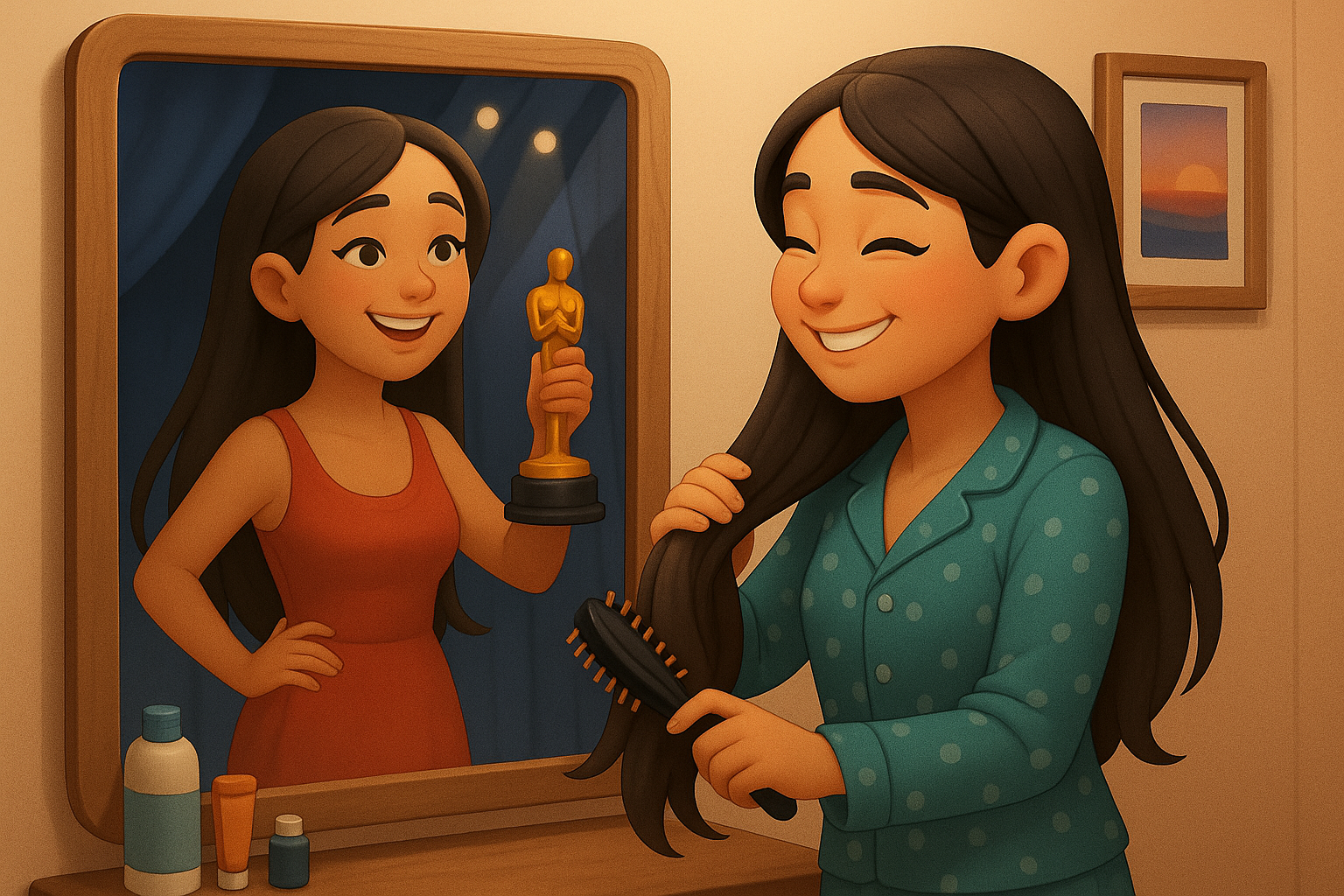 /Collection: /by davooda/Type: PNG/This vibrant digital illustration shows a young woman in pajamas brushing her hair while admiring herself in the mirror, holding an Oscar statuette. Perfect for personal branding and motivational content.