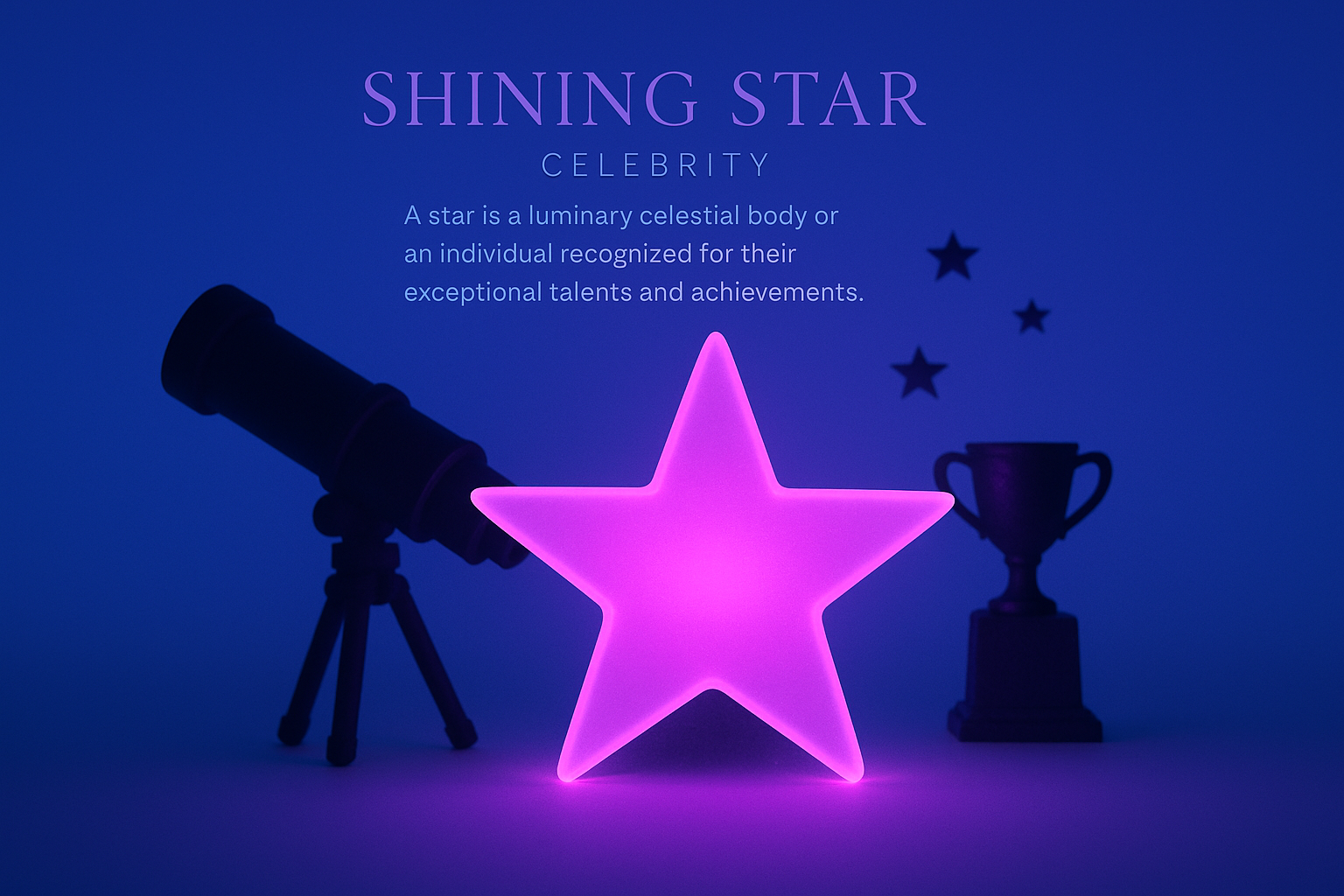 A vibrant composition featuring a glowing pink star against a solid blue background. The scene includes a telescope and a trophy, enhancing its celestial theme.