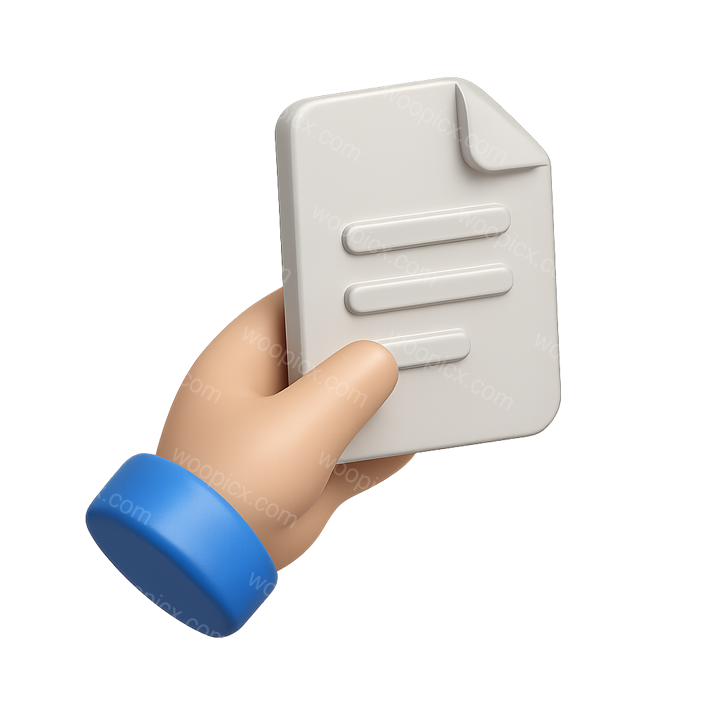 A 3D representation of a hand holding a document, featuring a stylized design with a three-quarter view. The document has a folded corner and horizontal lines, set against a soft gradient background.