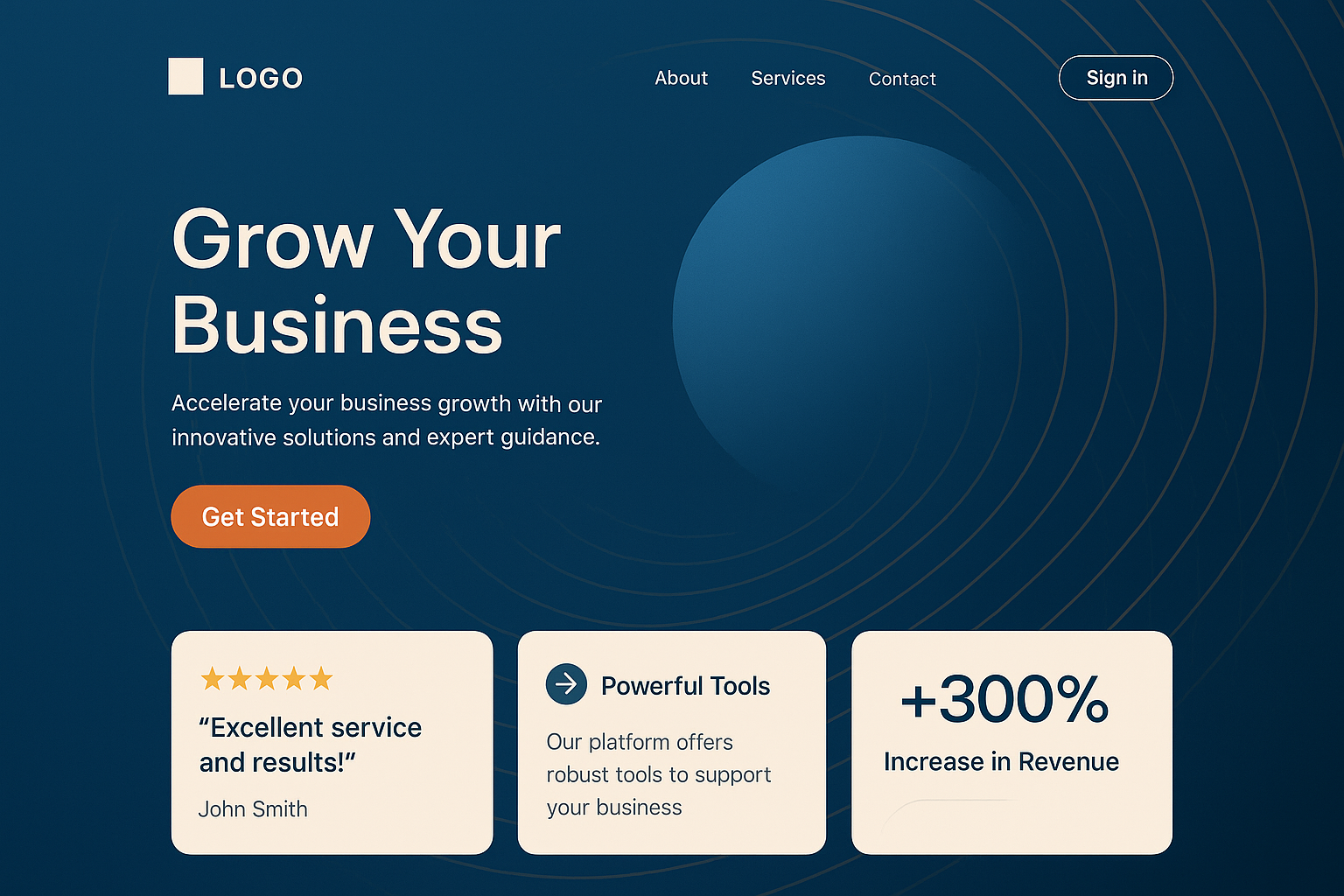 /Collection: /by davooda/Type: PNG/A visually appealing landing page design featuring a blue abstract background, geometric logo, and multiple content blocks highlighting business growth and features.