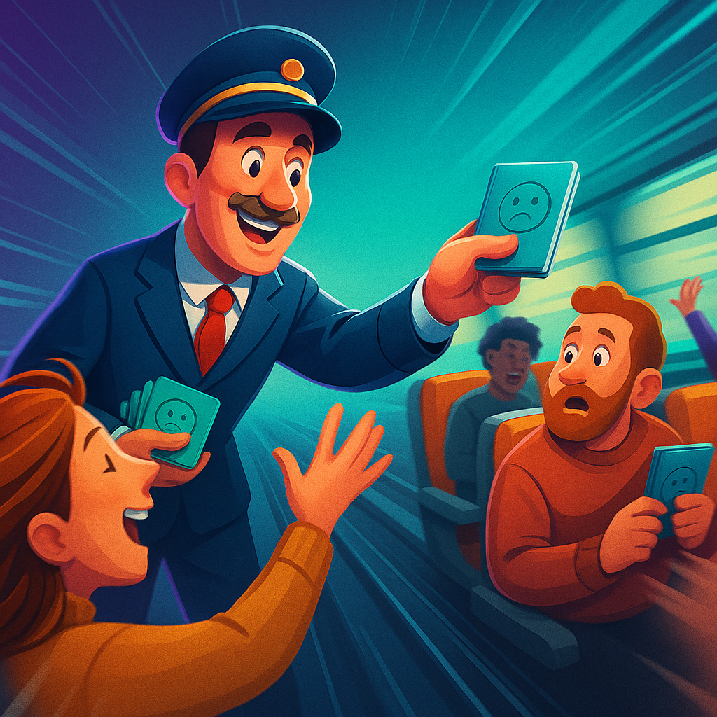 /Collection: /by davooda/Type: PNG/A conductor joyfully hands out emotional passports to engaged passengers on a train, capturing a lively and dynamic atmosphere with vibrant colors and expressive reactions.
