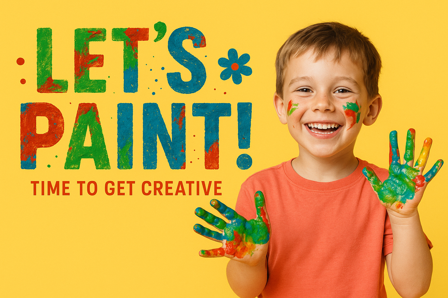 Vibrant promotional image featuring a smiling child with colorful paint on hands, perfect for art classes or creative workshops targeting young audiences.