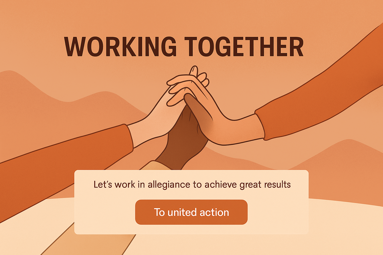 /Collection: /by davooda/Type: PNG/An illustration depicting hands joined together in unity, set against a warm gradient background. It conveys a message of teamwork and collaboration, complemented by engaging text elements.