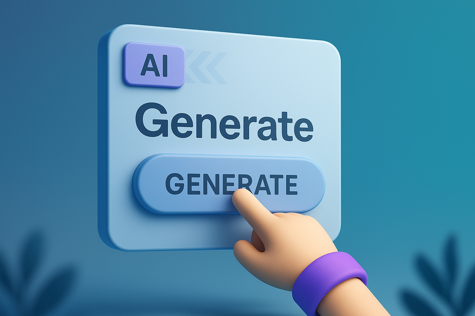 A 3D illustration of a neumorphic-style 'Generate' button with a hand pressing it. The design features a smooth gradient background and modern UI elements.