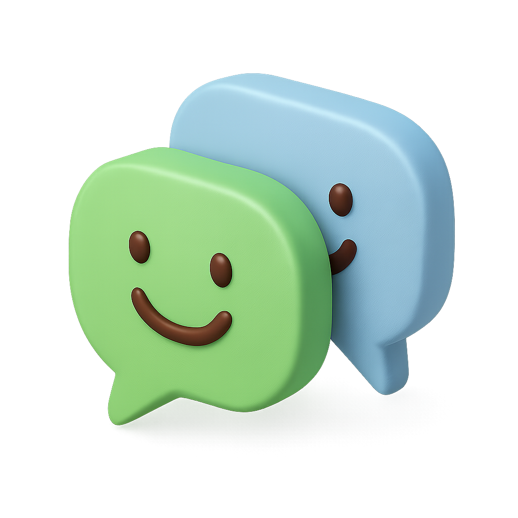 Two colorful 3D speech bubbles, one green and one blue, featuring smiling faces. The design has a transparent background and a soft isometric view, enhancing the playful feel.