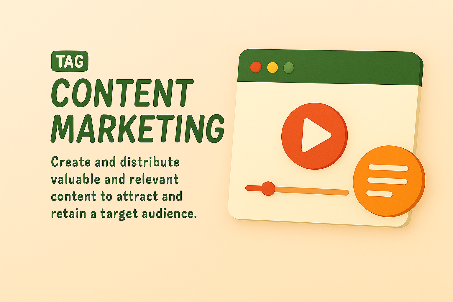 Stylized illustration representing content marketing, featuring a computer screen with play and menu icons. Ideal for digital marketing presentations or blog headers.