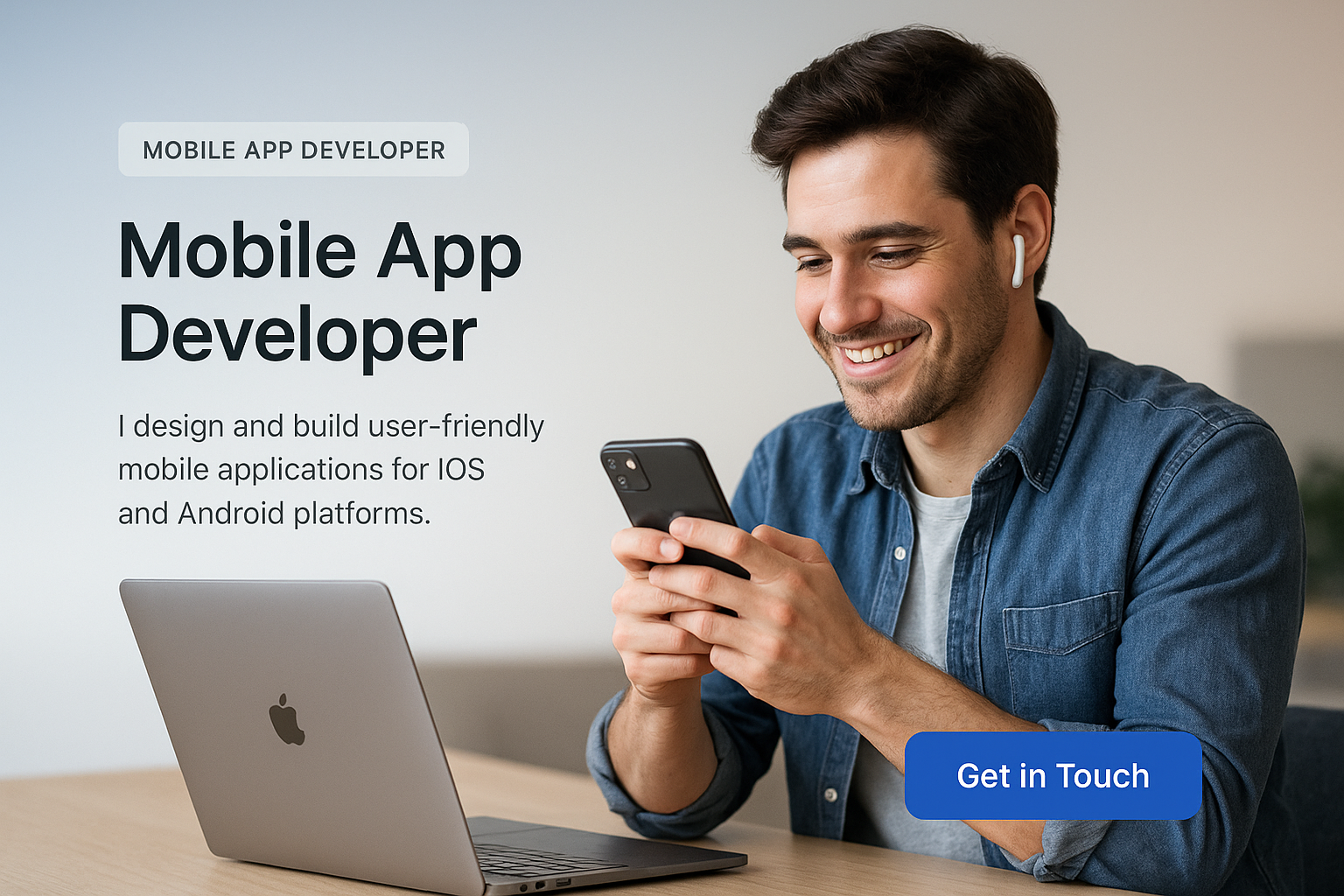 A modern web page design showcasing a mobile app developer engaging with a smartphone. It features a clean layout with a gradient background, text blocks, and a call-to-action button.