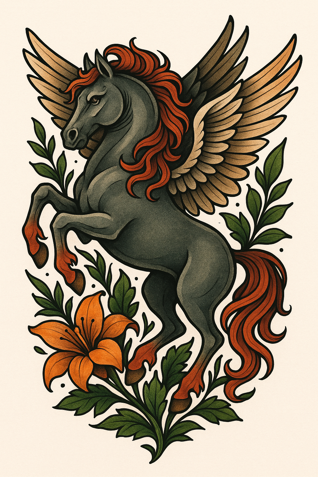 /Collection: /by davooda/Type: PNG/A vibrant fantasy illustration featuring a winged horse rearing up, surrounded by floral elements. This artwork is ideal for tattoo designs or fantasy-themed merchandise.