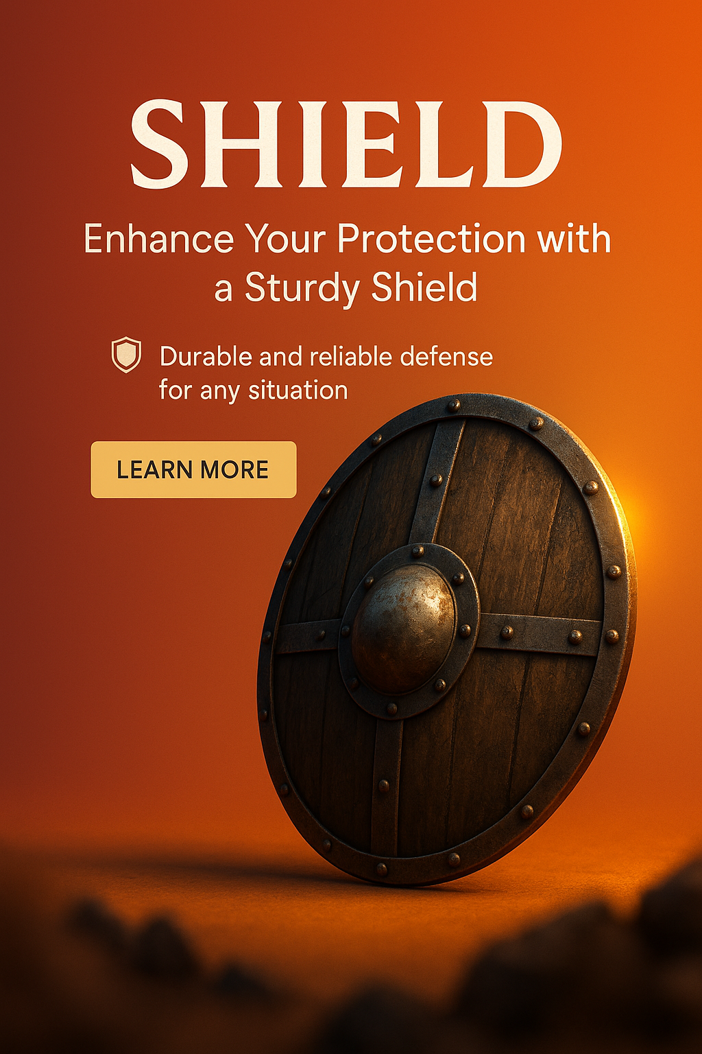 This is a promotional banner featuring a wooden shield, designed to convey strength and reliability. It targets customers seeking protective gear.