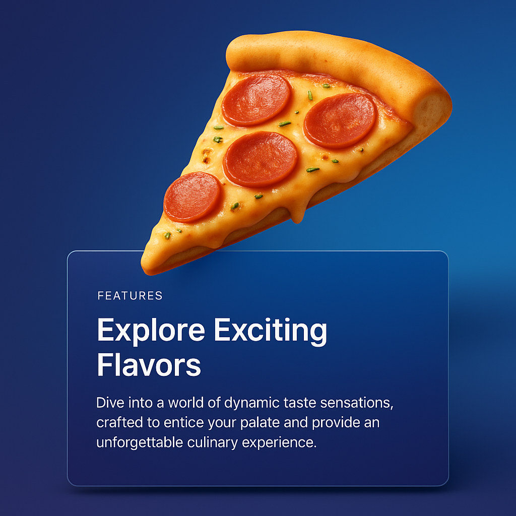 A dynamic 3D illustration of a delicious pepperoni pizza slice soaring against a smooth gradient background. Accompanied by a features block highlighting exciting flavors.
