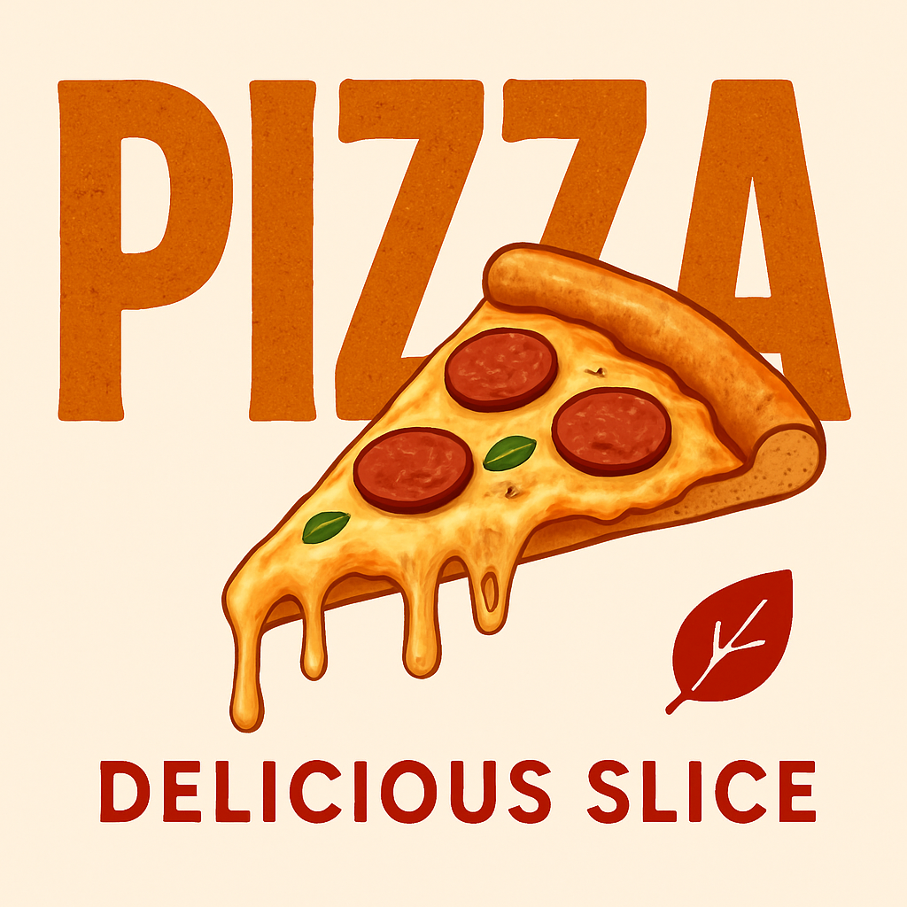 /Collection: /by davooda/Type: PNG/A vibrant illustration featuring a delicious pizza slice with pepperoni and cheese, complemented by bold typography, ideal for food-related branding or promotional materials.