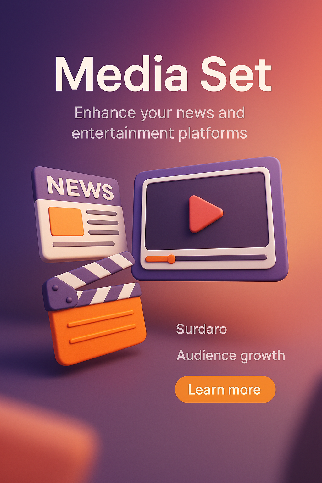 A colorful 3D graphic promoting a media set to enhance news and entertainment platforms, suitable for digital marketing use.