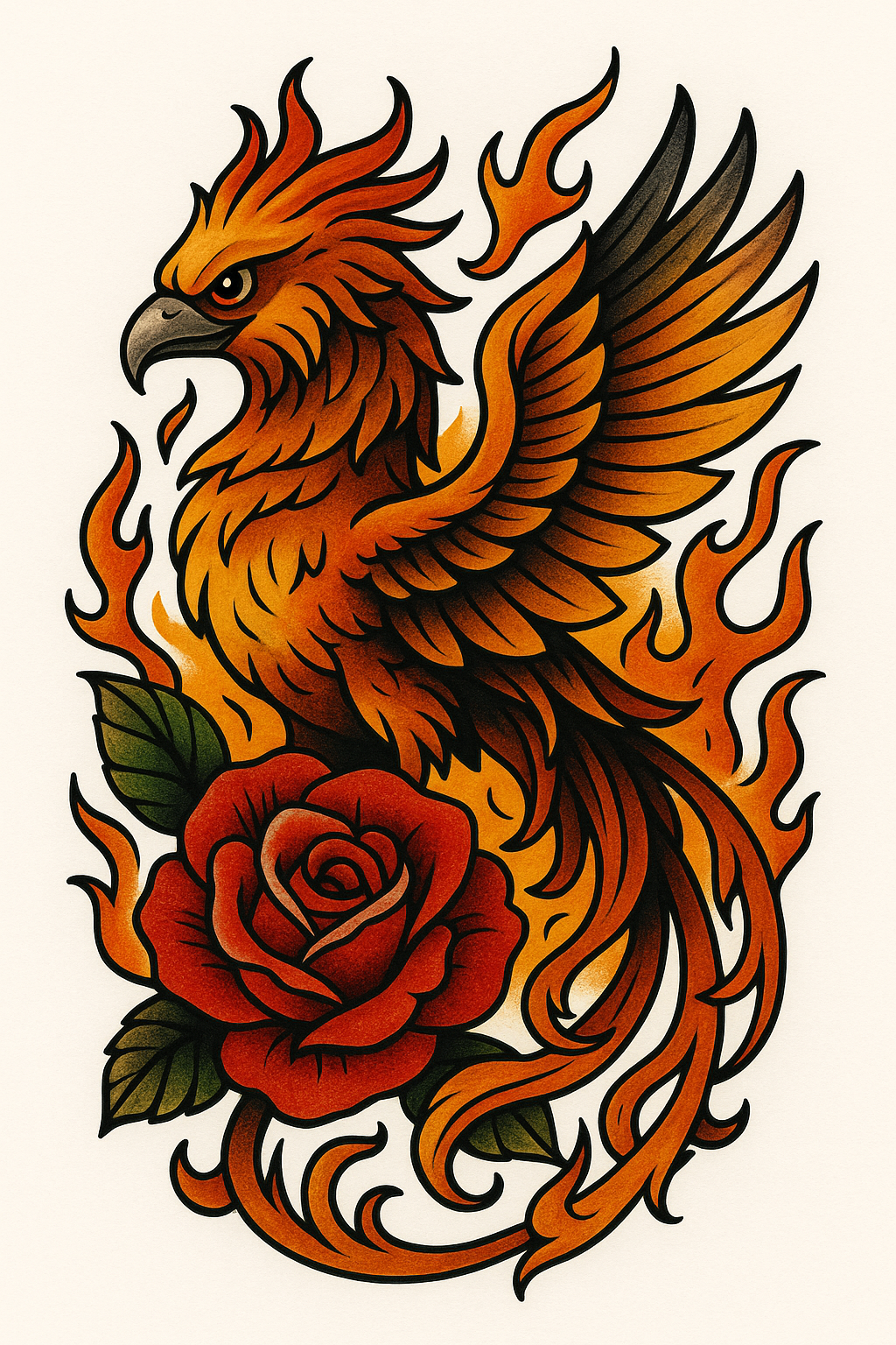 A striking tattoo design featuring a fiery phoenix surrounded by flames and a red rose. The bold colors and dynamic composition make it suitable for tattoo enthusiasts and artists.