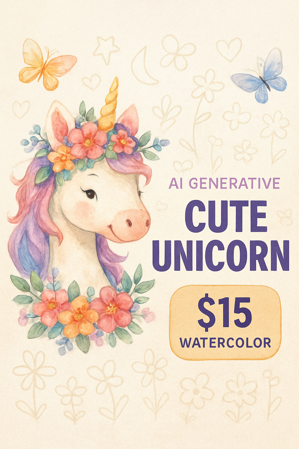 /Collection: /by davooda/Type: PNG/A vibrant watercolor illustration of a cute unicorn adorned with flowers, surrounded by butterflies. The design features bold typography and a clean layout, emphasizing the whimsical nature of the artwork.