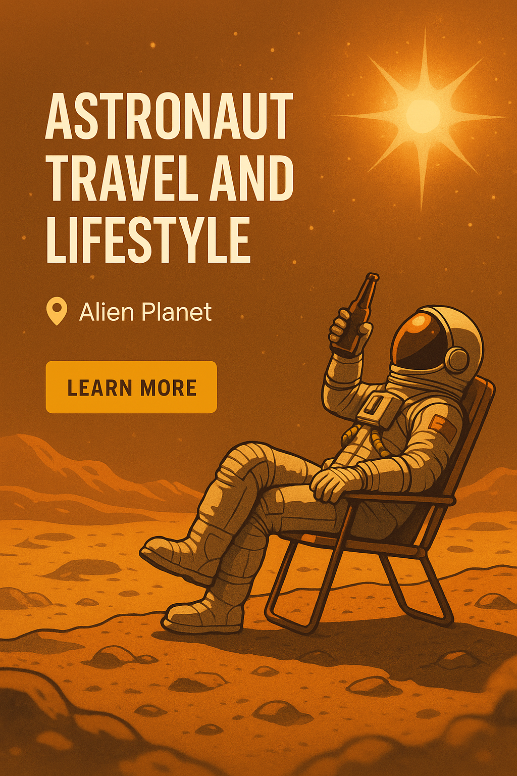 Illustrative promotional graphic showcasing an astronaut relaxing on an alien planet, ideal for travel and lifestyle marketing in a science fiction theme.