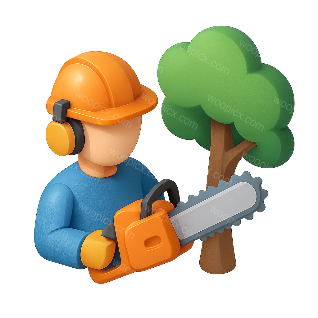 A 3D icon featuring a tree trimmer in a blue shirt and orange helmet using a chainsaw next to a green tree. The design has a volumetric feel with a transparent background.