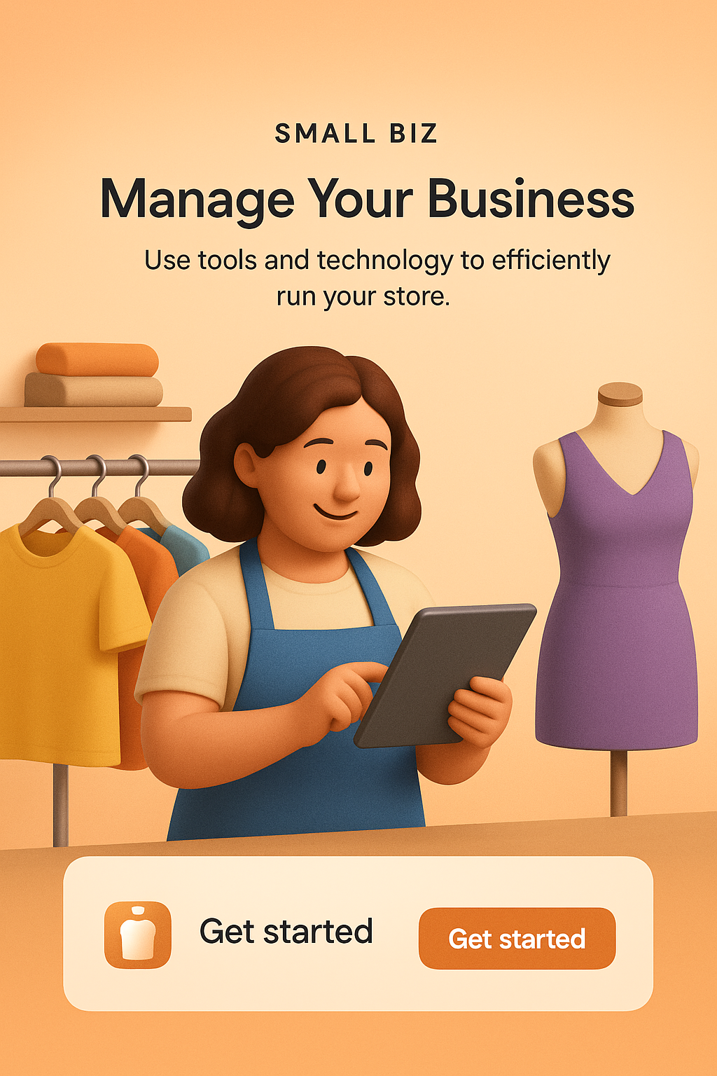/Collection: /by davooda/Type: PNG/A cheerful clothing store owner uses a tablet to manage her business. The image showcases a zoomed-out view with hanging clothes, a dress form, and clear text prompts.