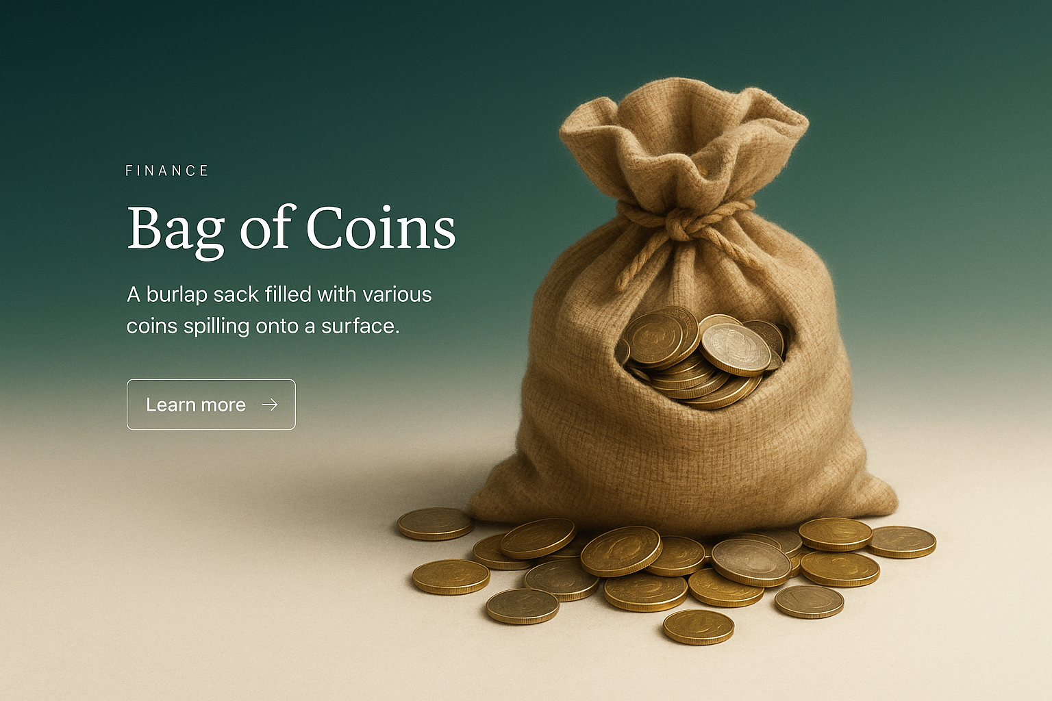 /Collection: /by davooda/Type: PNG/A visually appealing burlap sack filled with various coins, spilling onto a smooth surface. The gradient background transitions from dark to white, enhancing the focus on the coins.