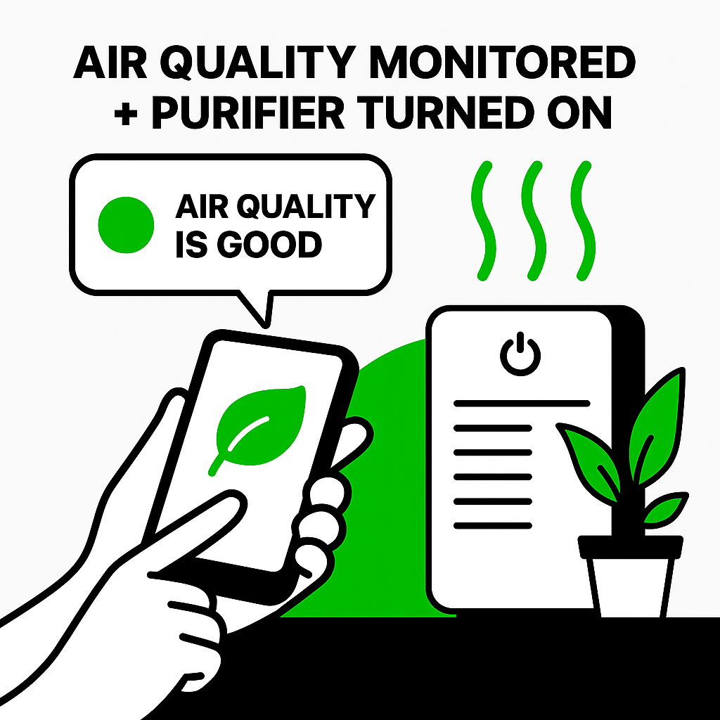 Stylized graphic depicting air quality monitoring with a smartphone and air purifier, emphasizing positive air quality. Ideal for health and wellness content.