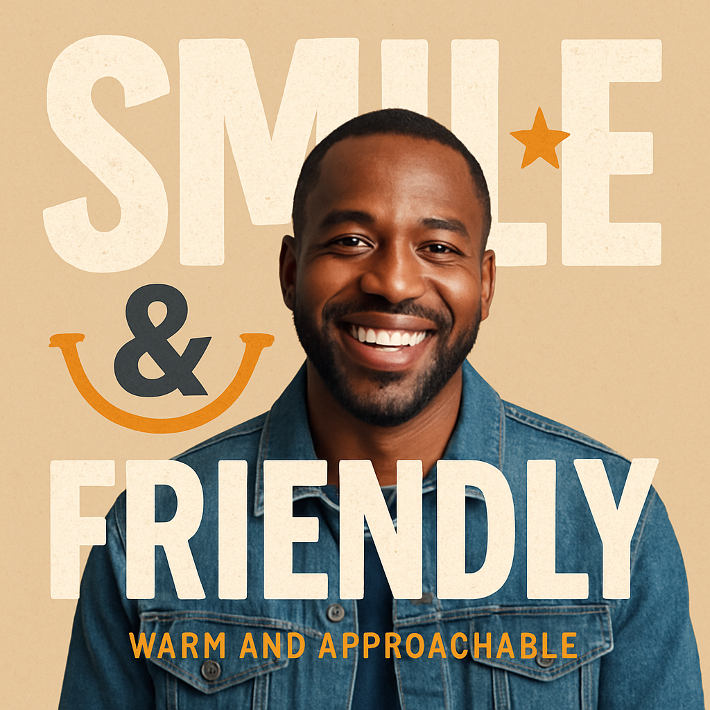 /Collection: /by davooda/Type: PNG/A visually engaging portrait showcasing a smiling individual, complemented by bold typography. The warm color palette enhances the approachable theme, ideal for social media or promotional content.
