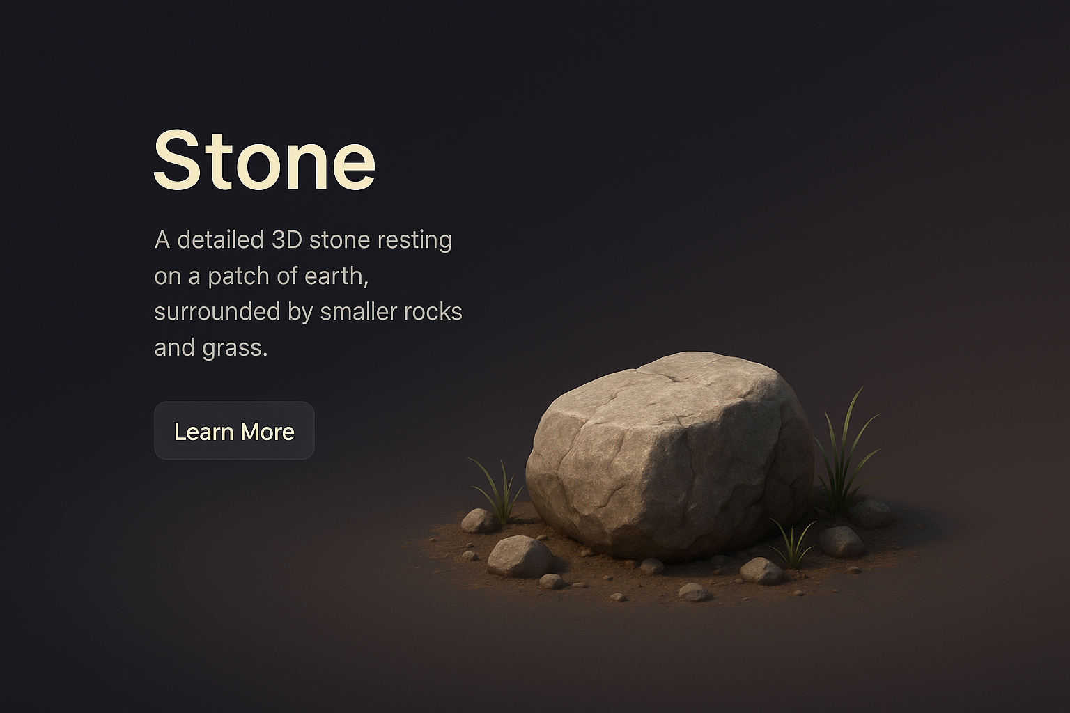 A detailed 3D rendering of a stone resting on earth, surrounded by smaller rocks and grass. The dark gradient background enhances the realism of the scene.