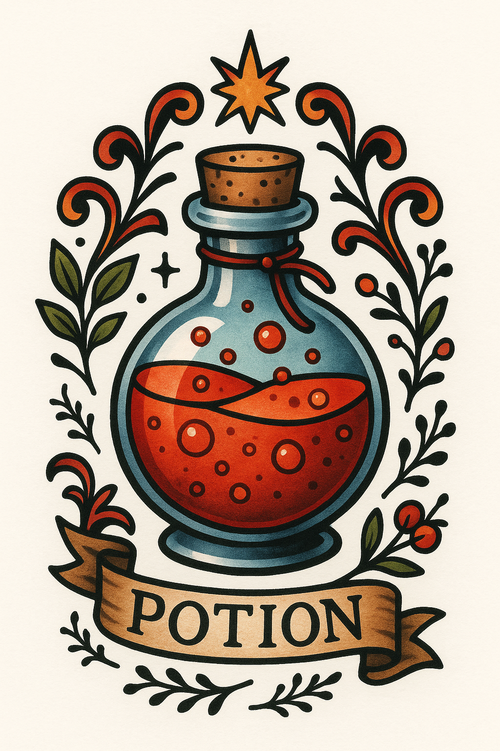 Vibrant and whimsical illustration of a potion bottle surrounded by decorative floral elements, ideal for fantasy-themed decor or merchandise.