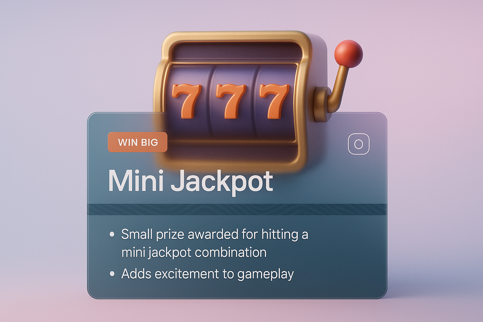 /Collection: /by davooda/Type: PNG/A vibrant 3D illustration featuring a mini jackpot slot machine. The design includes a transparent label with clear text, enhancing readability against a smooth gradient background.