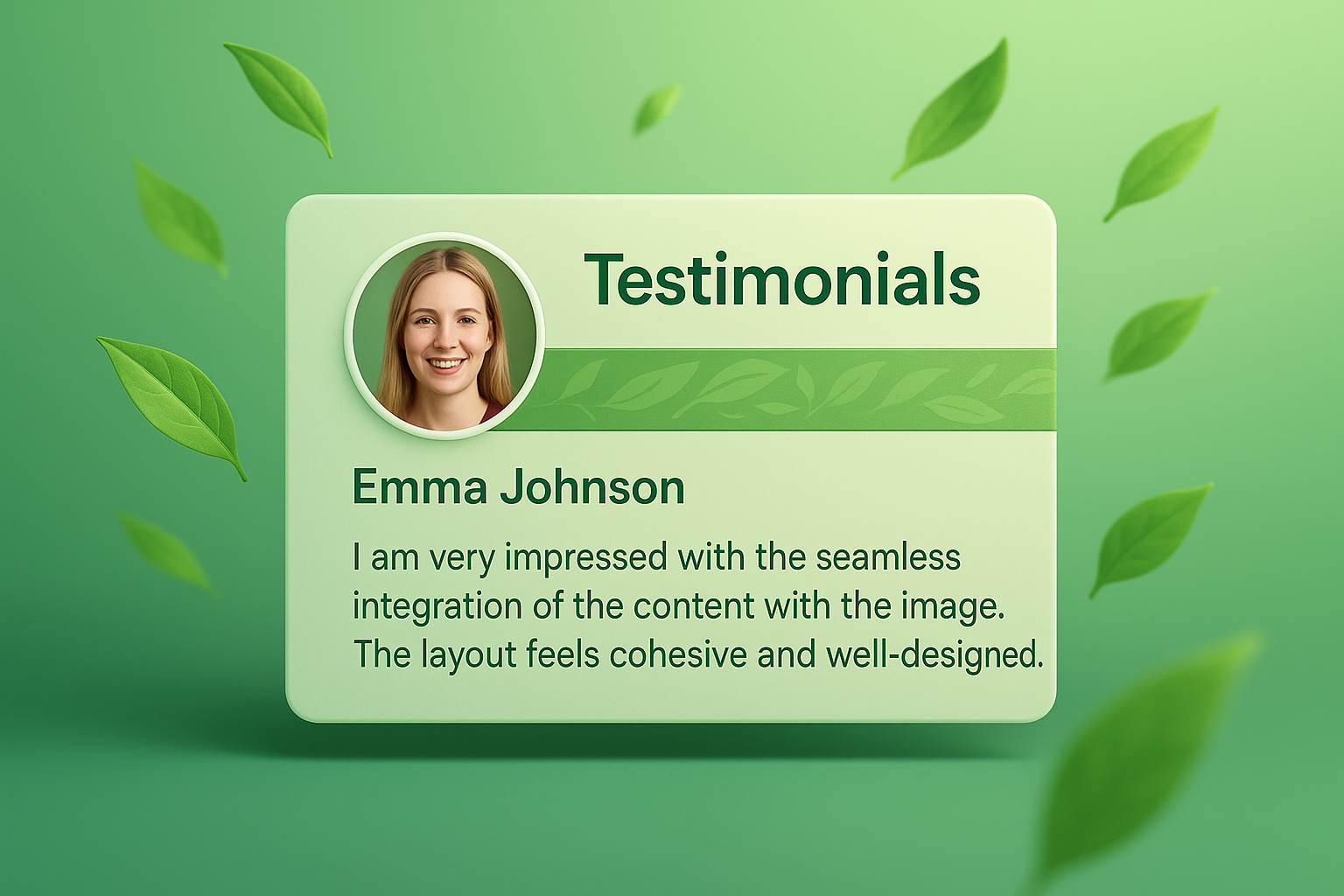 /Collection: /by davooda/Type: PNG/A vibrant testimonials section featuring a circular photo of Emma Johnson alongside her testimonial text. The design incorporates green leaves and a smooth gradient background, promoting an eco-friendly aesthetic.