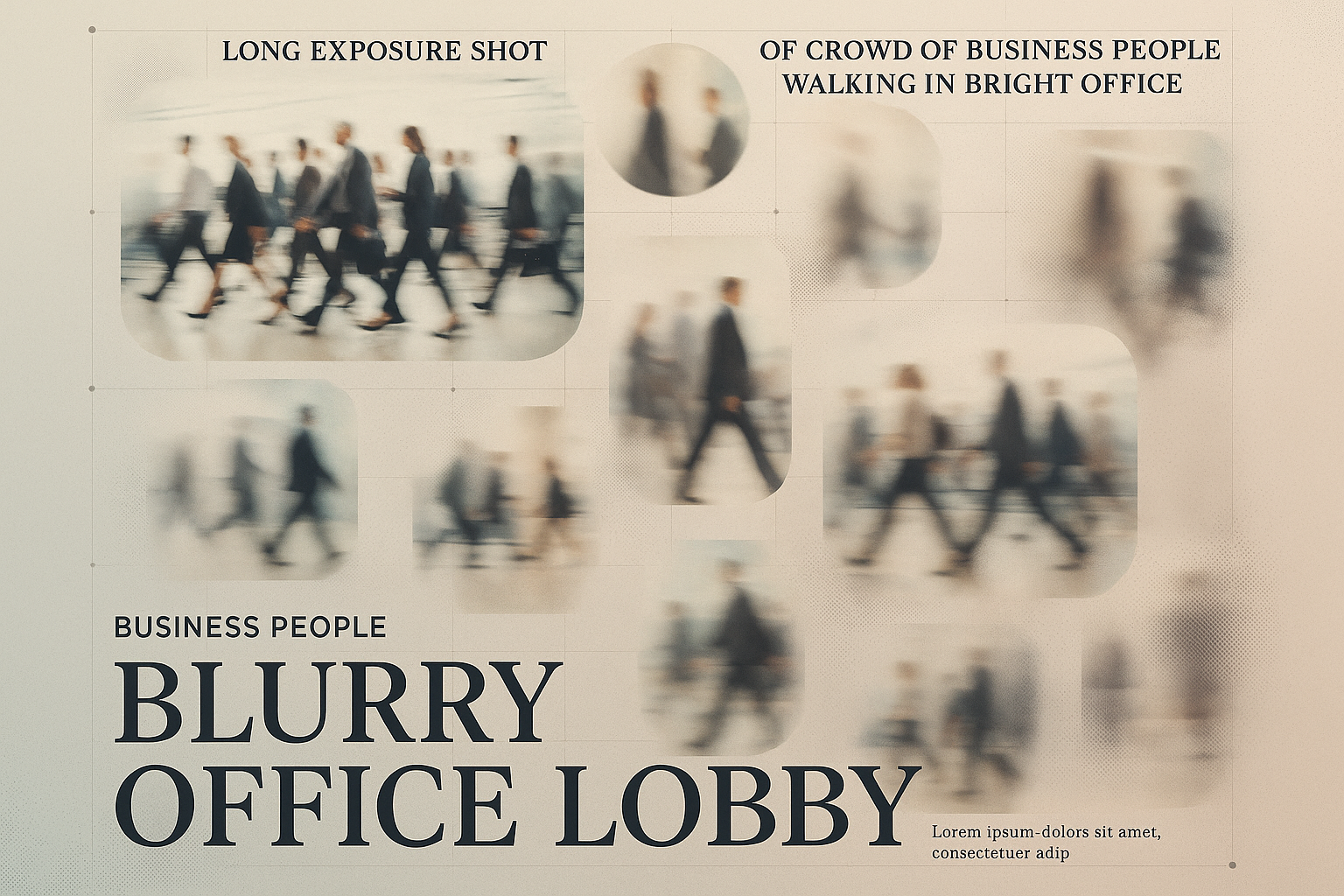 /Collection: /by davooda/Type: PNG/A long exposure shot capturing a dynamic crowd of business professionals moving through a bright office lobby, with a soft blurred effect creating depth and motion.