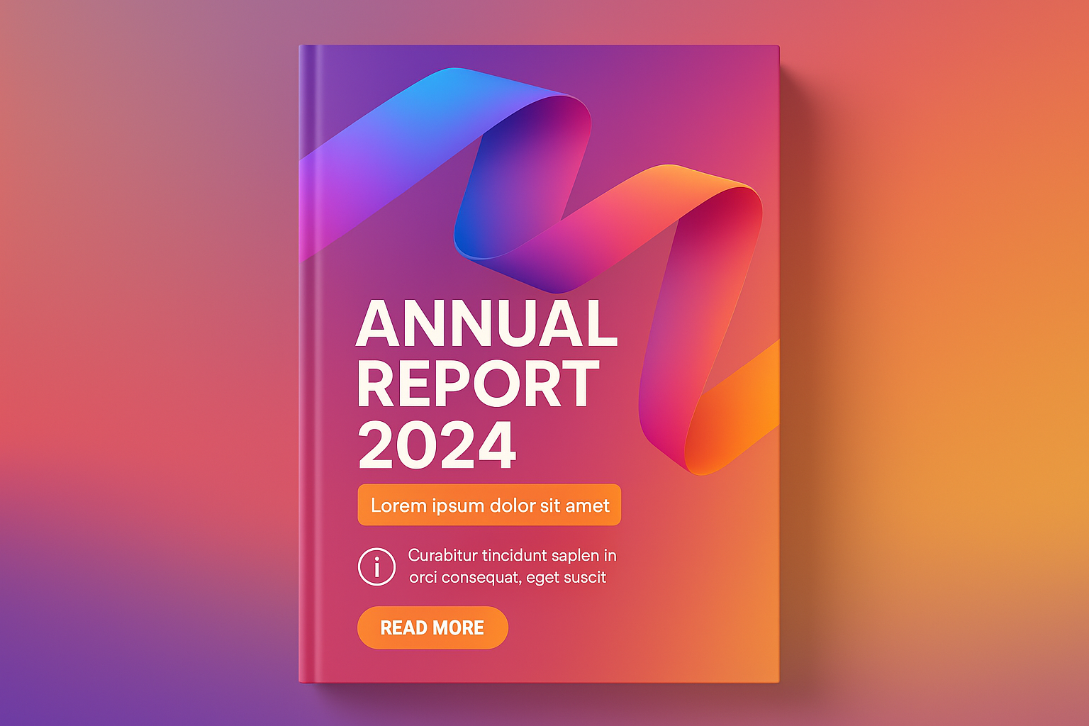 Stylish annual report cover featuring a vibrant gradient background and dynamic ribbon design, ideal for corporate presentations and professional publications.