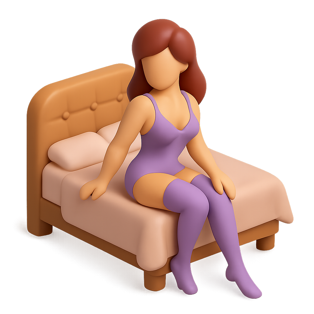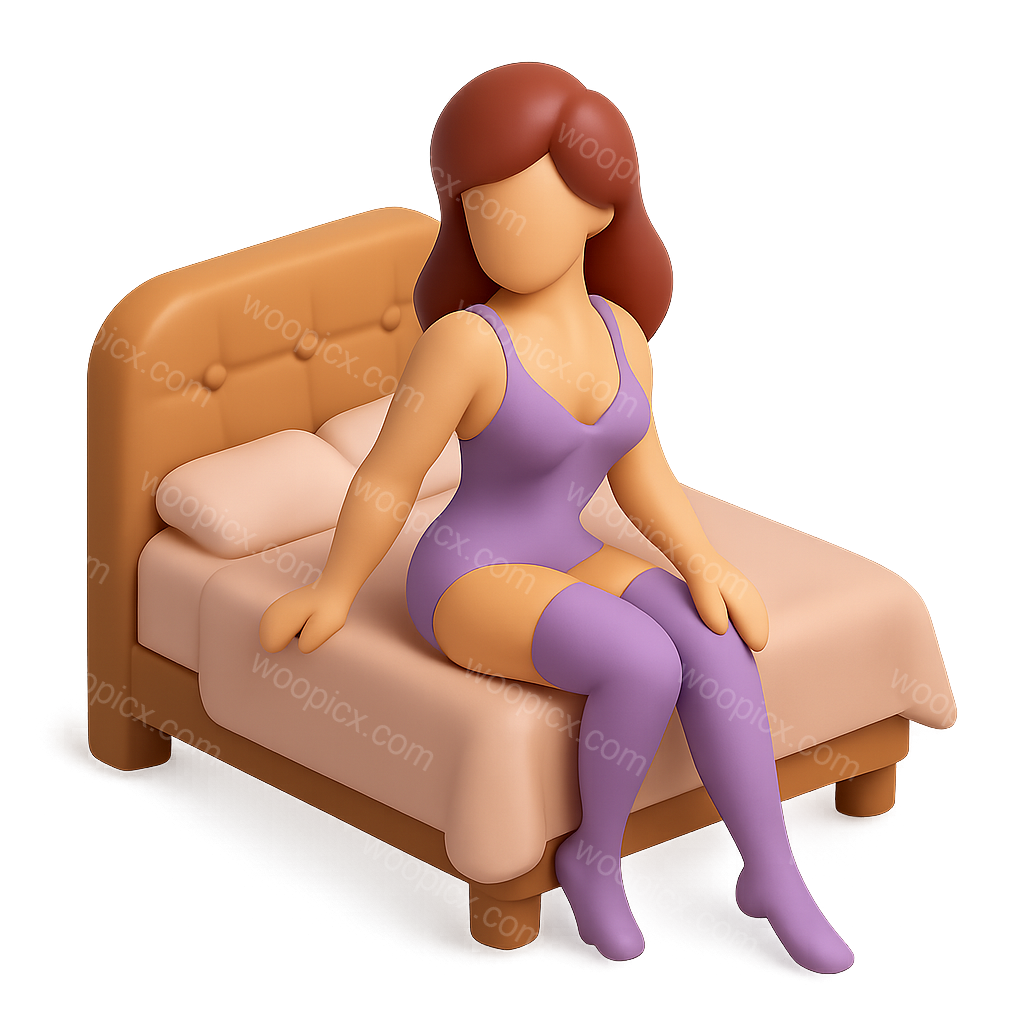 A minimalistic 3D icon depicting a figure seated on a bed, showcasing a stylized design with a volumetric feel. The figure is wearing a purple outfit and has a smooth, isometric appearance.