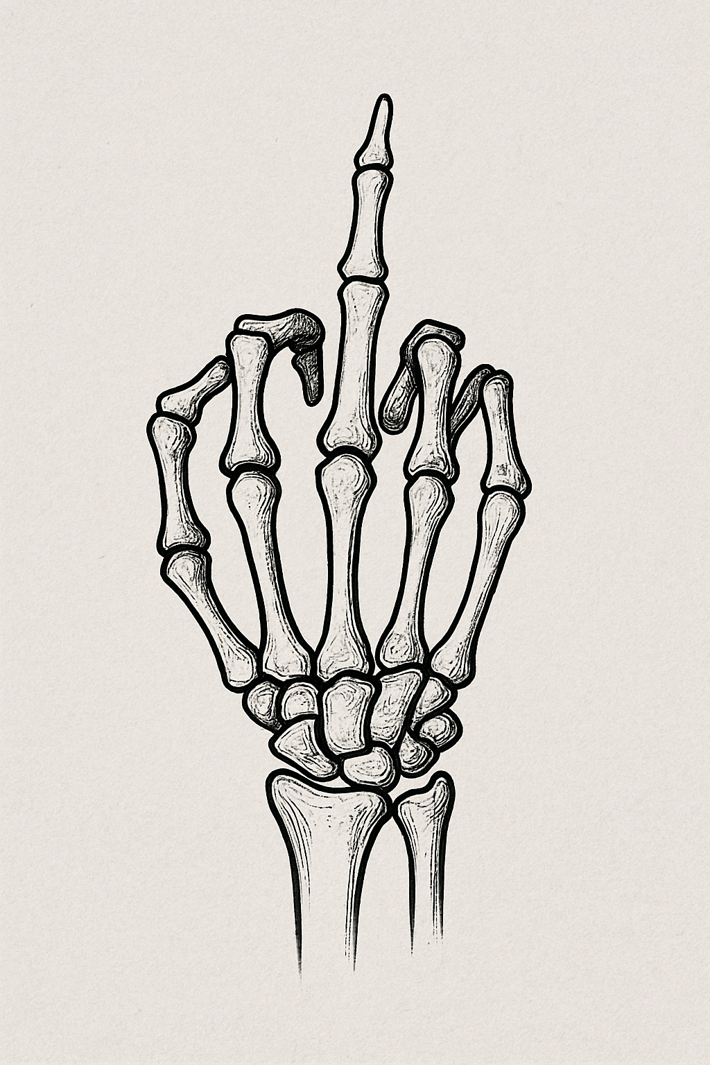 This is a detailed illustration of a skeleton hand displaying a gesture. The design is artistic and can be used in various contexts such as art, humor, or educational materials.