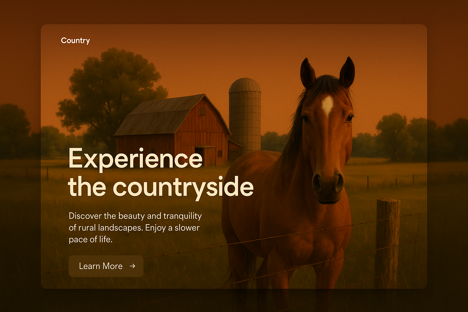 A stylish web page featuring a horse and barn, promoting rural tranquility. Includes a clean layout with a gradient background and concise text.