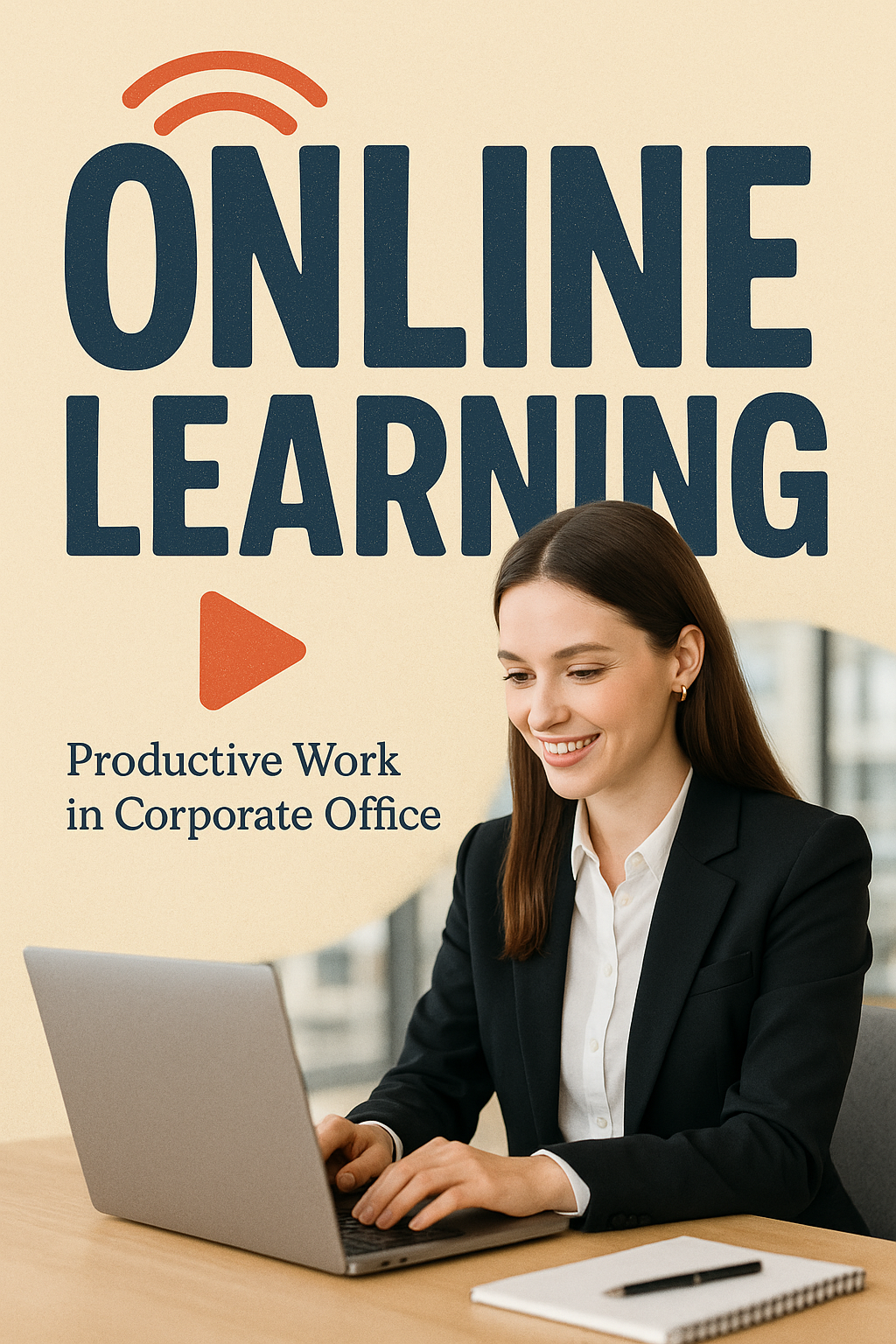/Collection: /by davooda/Type: PNG/A modern promotional image showcasing online learning in a corporate office setting, featuring a smiling professional engaged in work. Ideal for educational content and corporate training.