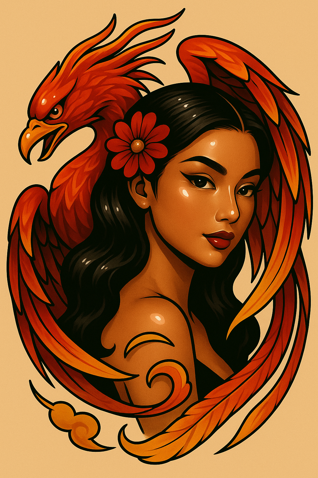 /Collection: /by davooda/Type: PNG/This image features a beautifully stylized portrait of a girl with long dark hair, accompanied by a vibrant phoenix. The artwork has a glossy finish, resembling classic tattoo art with anime-like highlights.