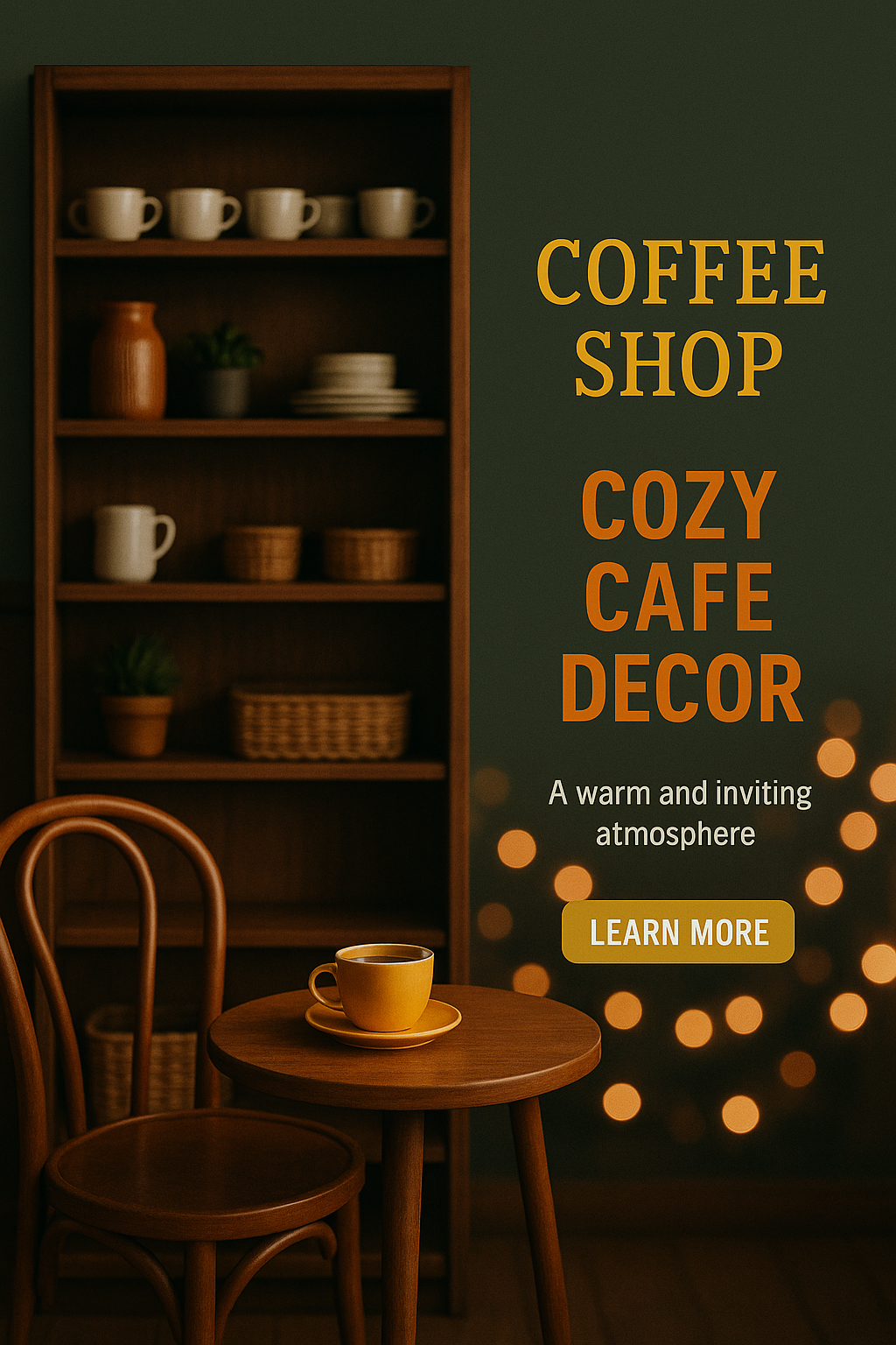 A warm and inviting promotional graphic showcasing a coffee shop's decor with a focus on a cozy atmosphere, perfect for attracting customers.
