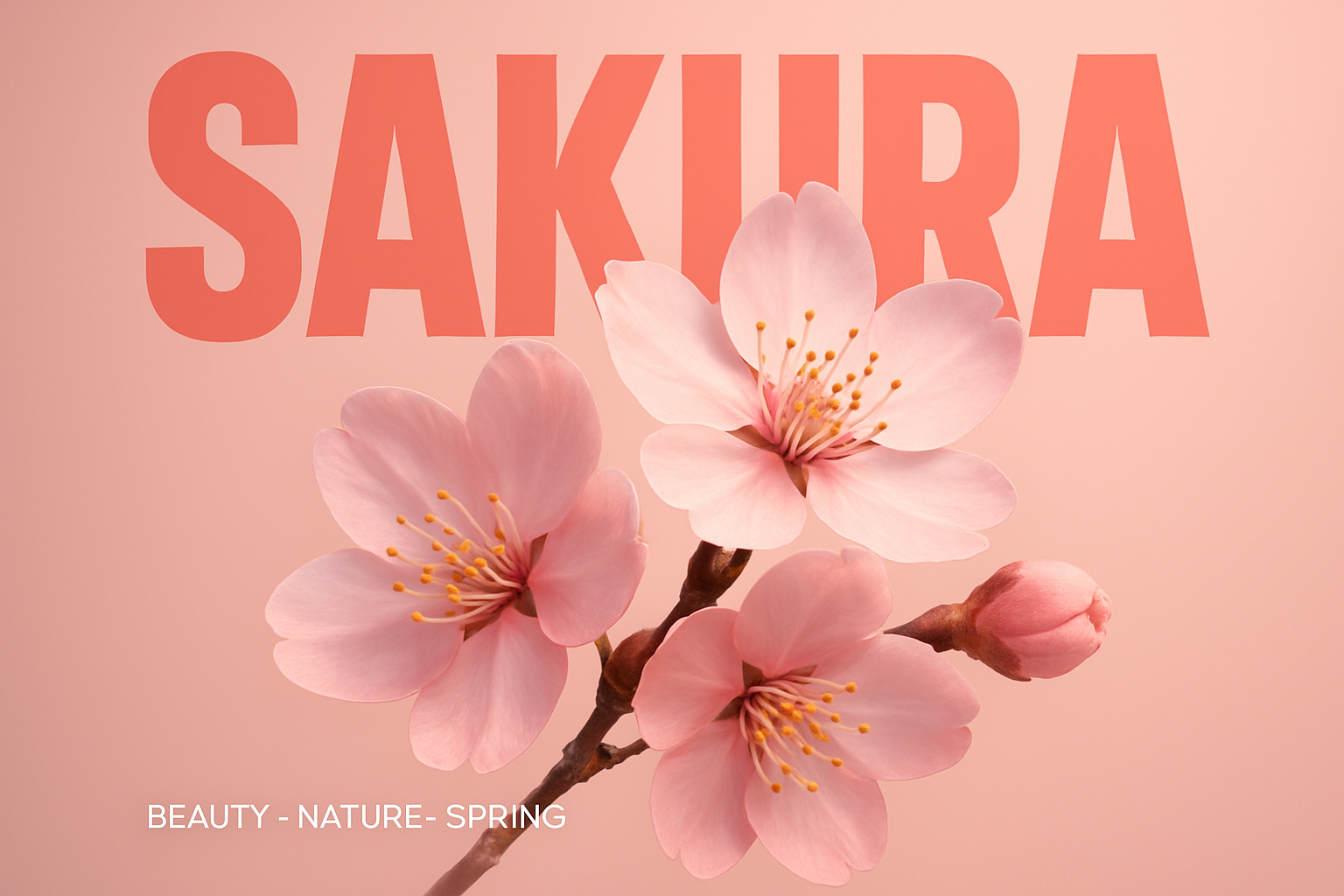 A stunning composition featuring sakura flowers against a soft gradient background. The bold 'SAKURA' headline dominates the upper half, enhancing the modern and cinematic feel.