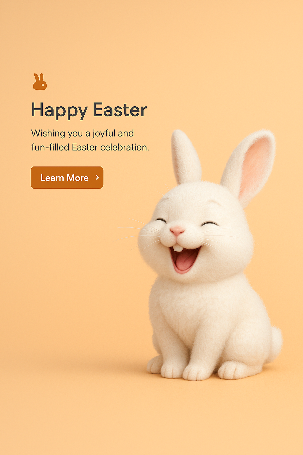 /Collection: /by davooda/Type: PNG/A cheerful white rabbit with a big smile, set against a soft orange gradient background. The bunny wishes viewers a joyful Easter with a friendly message and a call-to-action button.