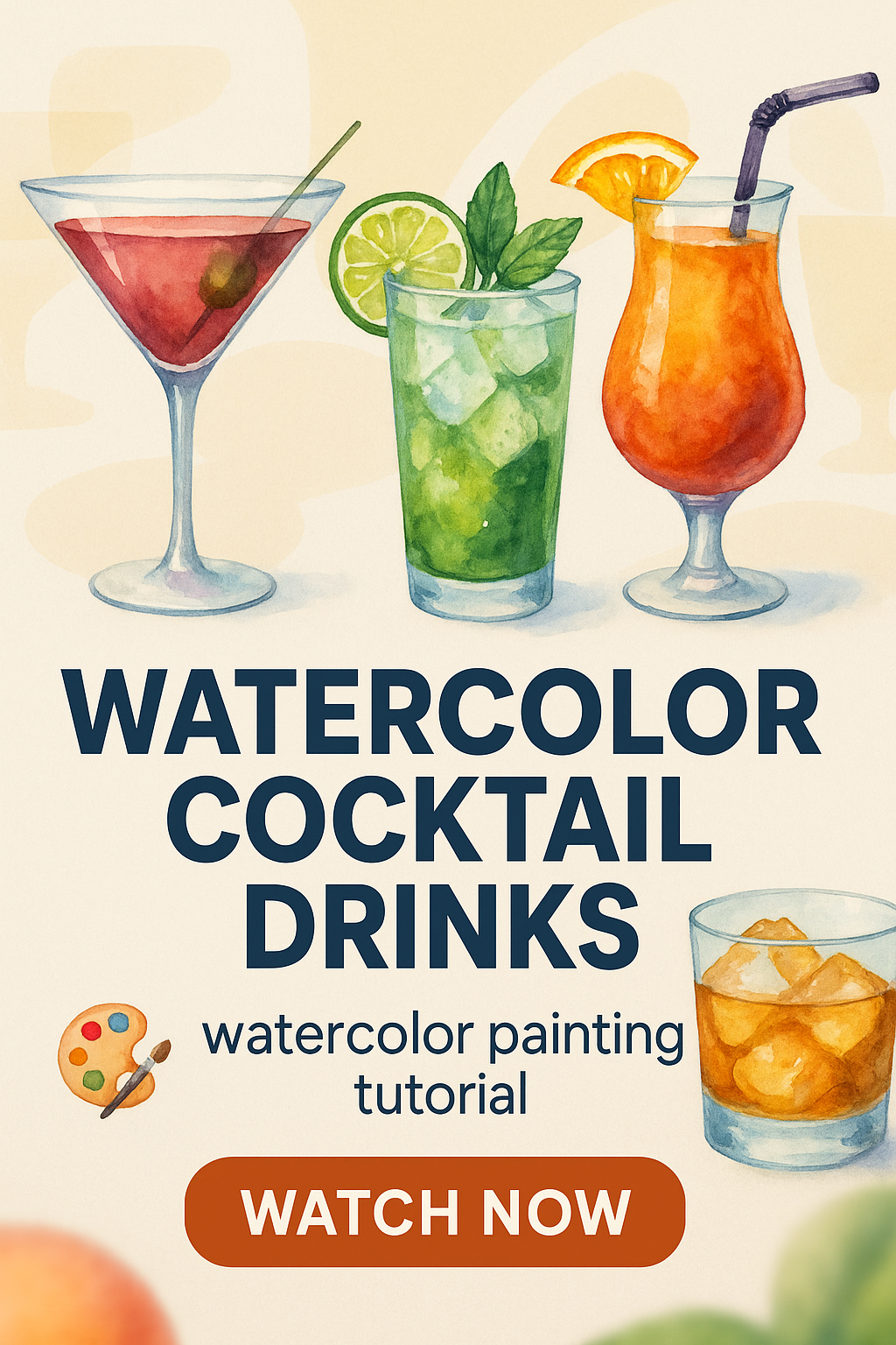 Vibrant promotional graphic for a watercolor painting tutorial featuring illustrated cocktails. The design is colorful and engaging, aimed at art enthusiasts and hobbyists.