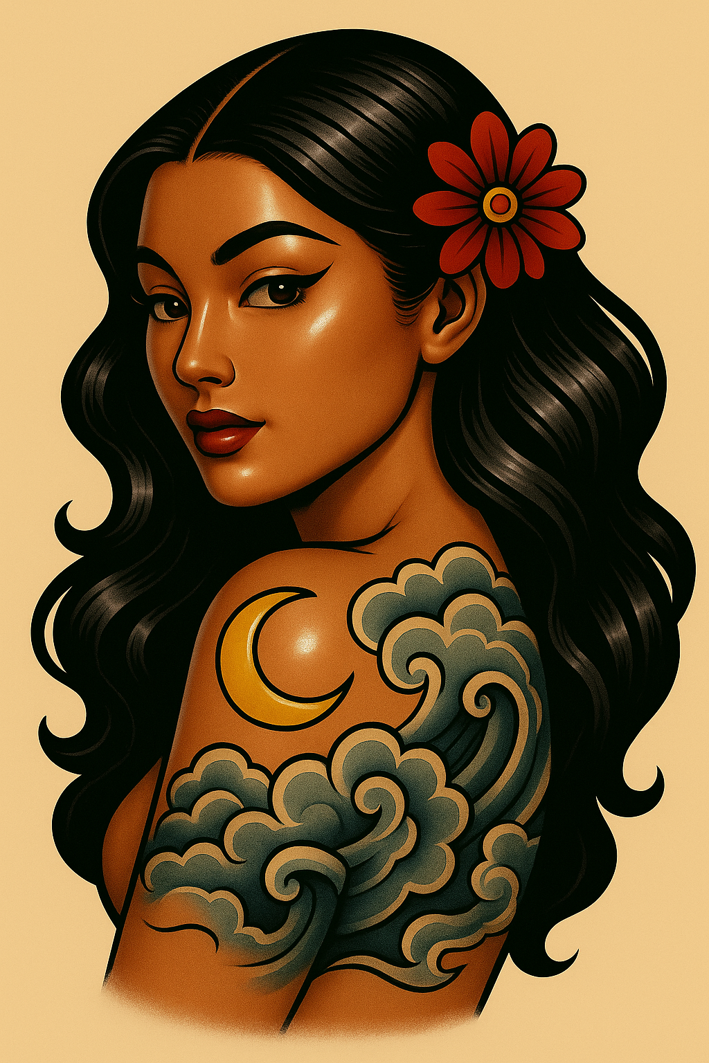 A stylish depiction of a girl with moon and wave tattoos, showcasing a glossy finish reminiscent of classic tattoos. The background is a soft beige, enhancing the artwork's vibrant colors.