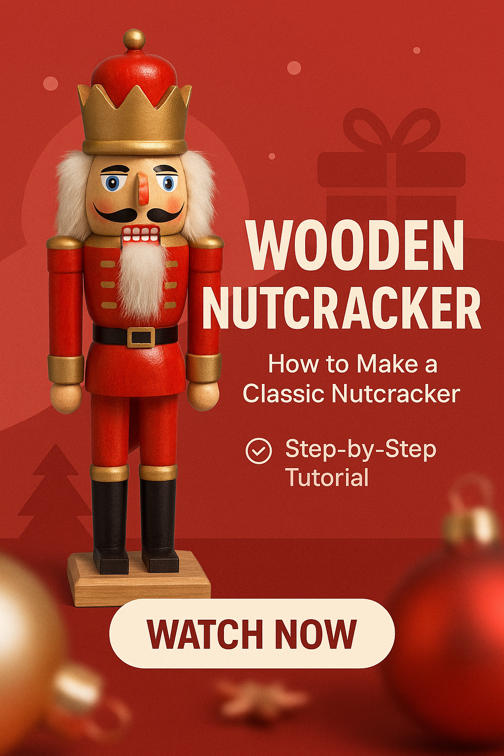 A vibrant promotional graphic for a step-by-step tutorial on making a classic wooden nutcracker. The design features a festive background with holiday elements, ideal for seasonal craft enthusiasts.
