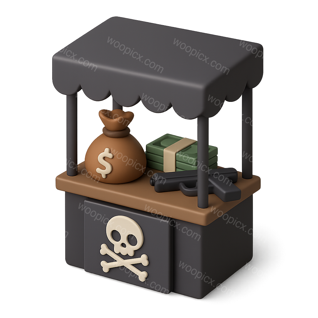 A 3D icon depicting a black market stand featuring a money bag, stacks of cash, and a gun, all set against a transparent background in a three-quarter view.