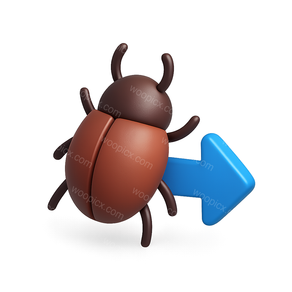 A stylized 3D beetle icon with a shiny brown body and a blue arrow pointing right, designed in a three-quarter isometric view, featuring a smooth, volumetric feel.