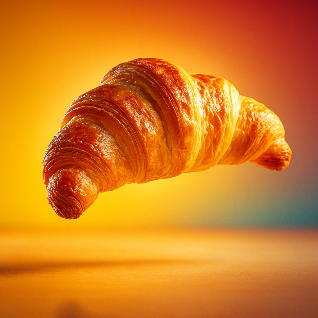 /Collection: /by davooda/Type: PNG/A beautifully illuminated croissant floats mid-air against a vibrant gradient background, showcasing its flaky texture and golden hues, with soft reflections on the surface below.