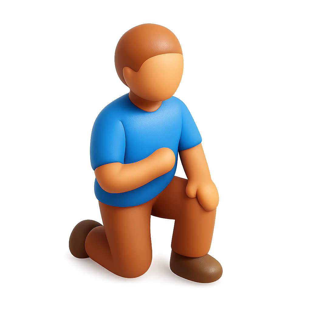 A stylized 3D icon depicting a person kneeling in a three-quarter view. The figure is simple, with a blue shirt and brown pants, set against a smooth gradient background.