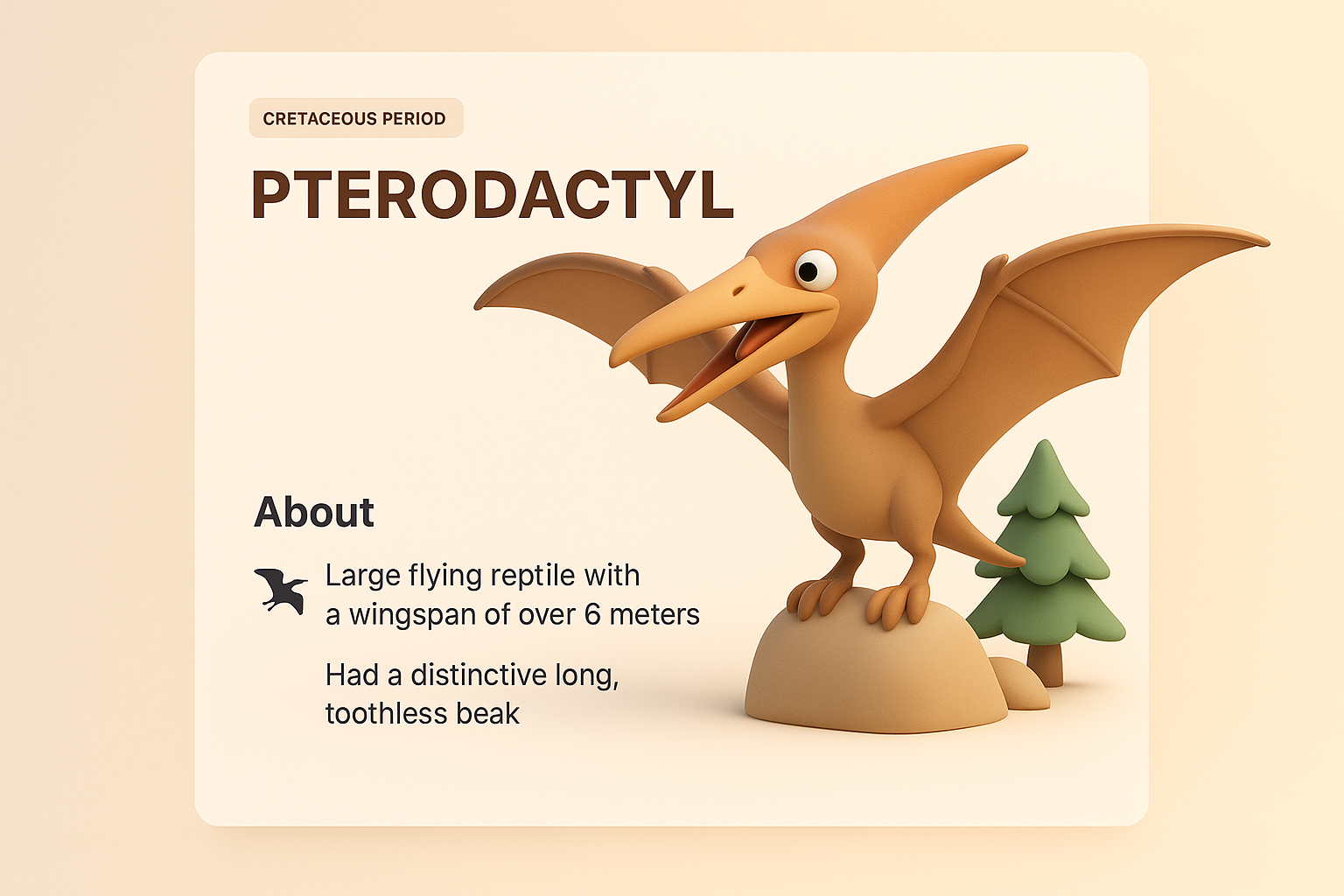 A vibrant 3D illustration of a pterodactyl perched on a rock, featuring a light gradient background. Accompanied by informative text about its characteristics.