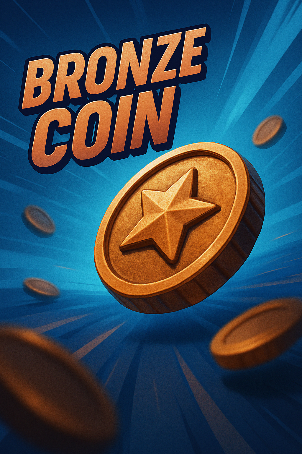 A striking 3D bronze coin featuring a star design, set against a vibrant blue gradient background. Dynamic rays emanate from the center, emphasizing movement.