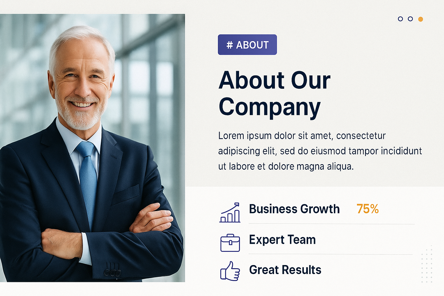 Professional corporate profile image featuring a smiling executive with key performance indicators, ideal for business presentations and company websites.
