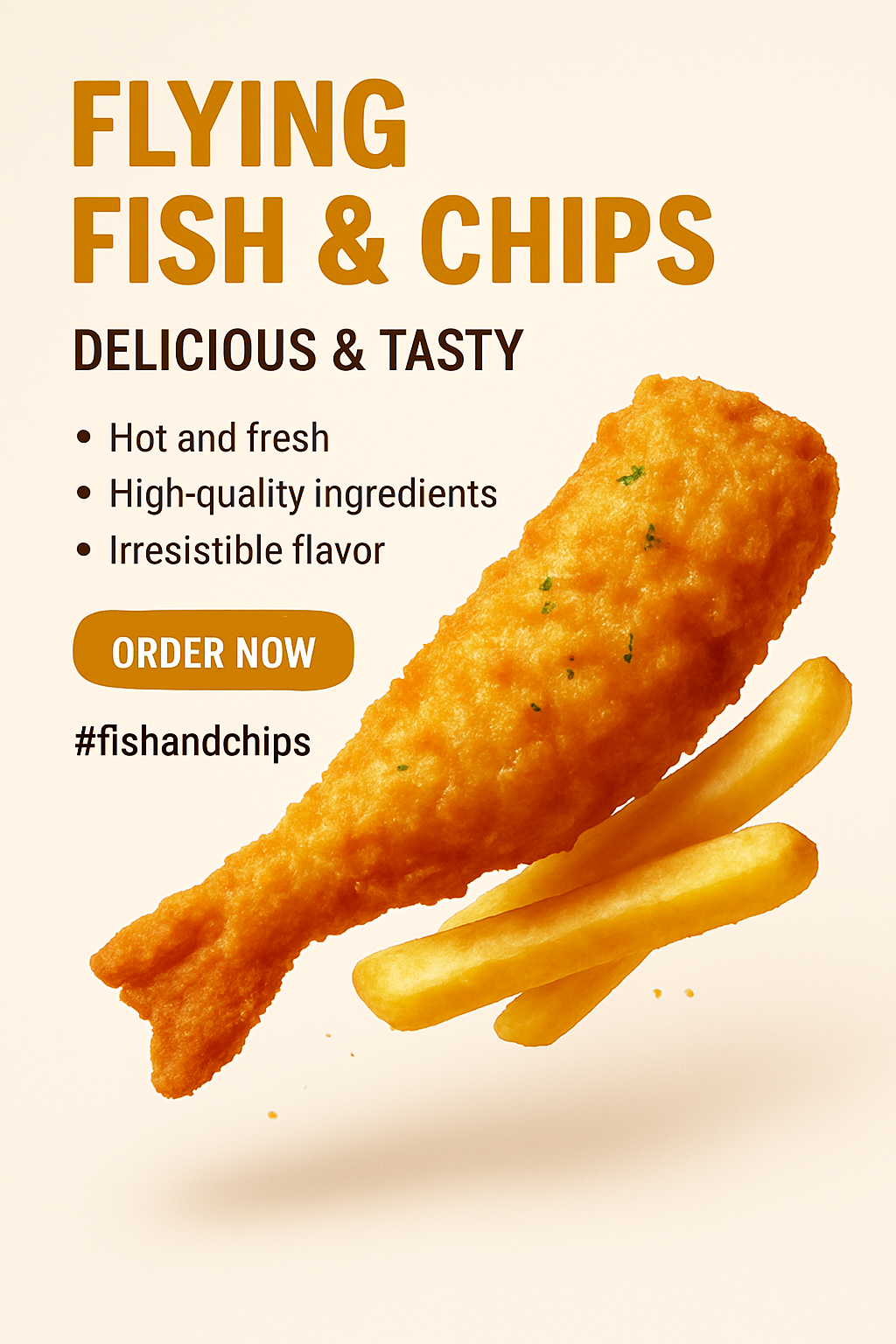 Vibrant promotional graphic showcasing delicious fish and chips, emphasizing freshness and quality. Ideal for restaurant marketing and food promotions.